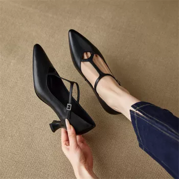 Genuine Leather Mary Jane Pumps for Women – Pointed Toe Mid Heel Shoes